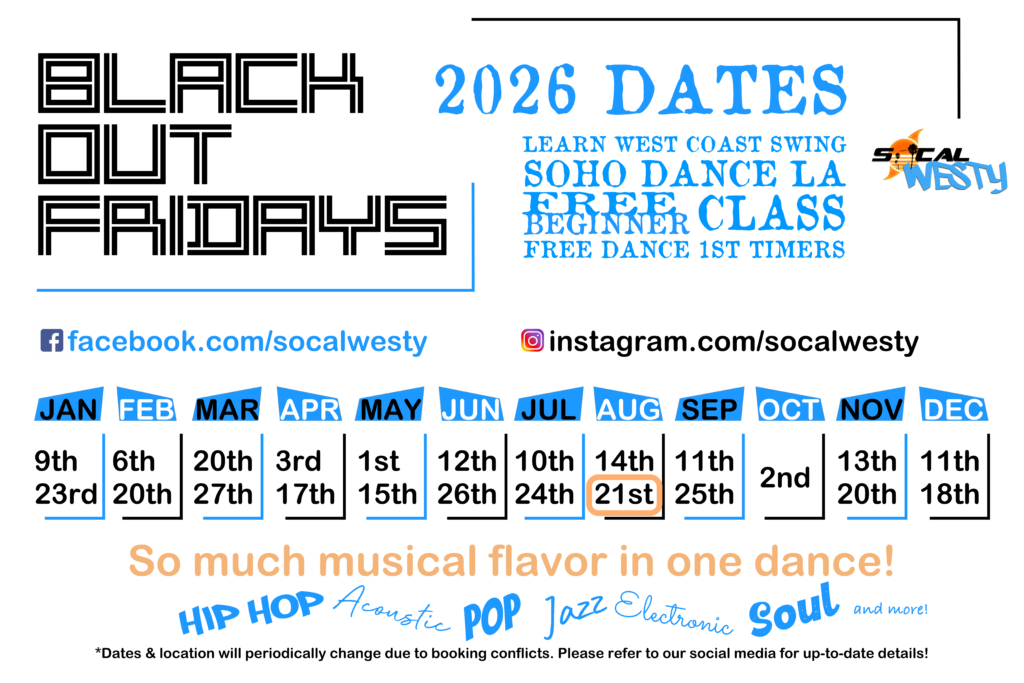 ****We typically host our night @ SoHo Dance LA – 1618 Cotner Ave. Los Angeles, California 90025. We have 1 currently planned deviation from that, which is listed above on our flyer circled in red. We’ll be at WWLA!!! Blackout Friday at WWLA 8/23/2024 We might, for unseen circumstances, be required to move in addition to the night we already know about; we also on occasion try Pop Up venues for a special feel or to engage a new area of dancers. So please see the specific FB Event page for each date to stay fully informed on dates and venues.
